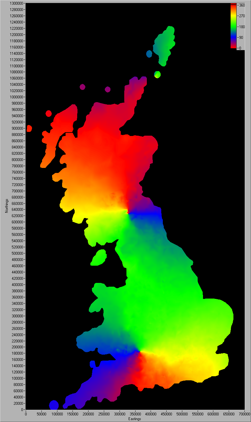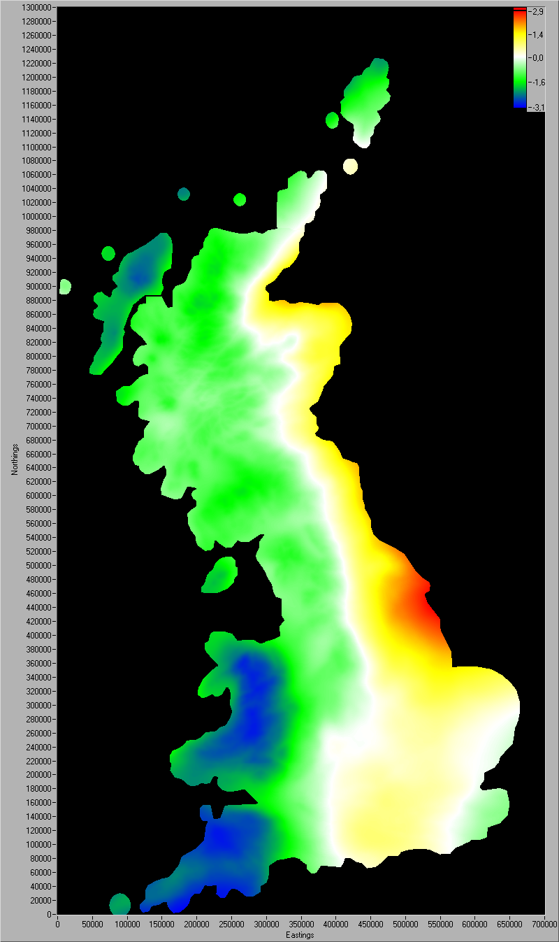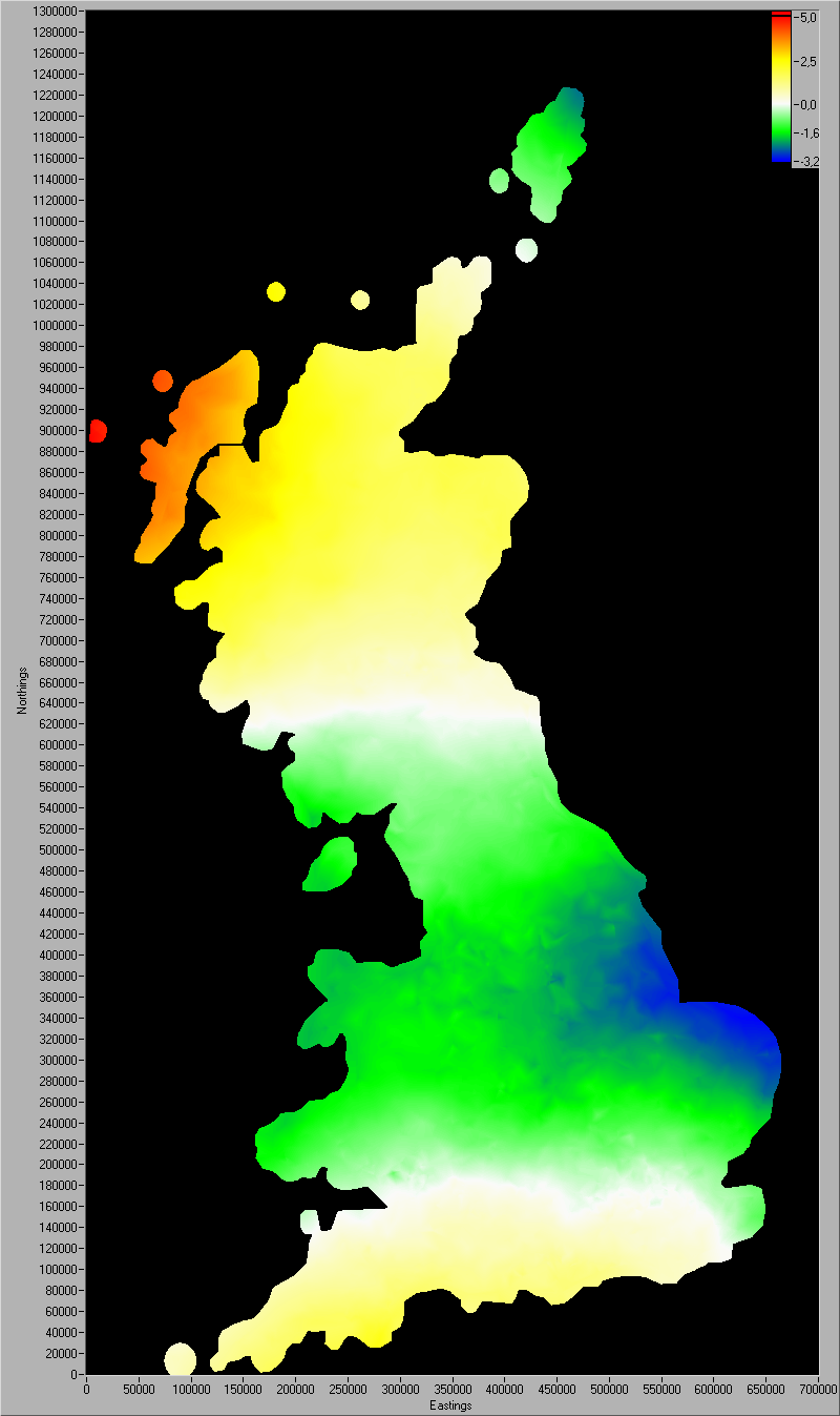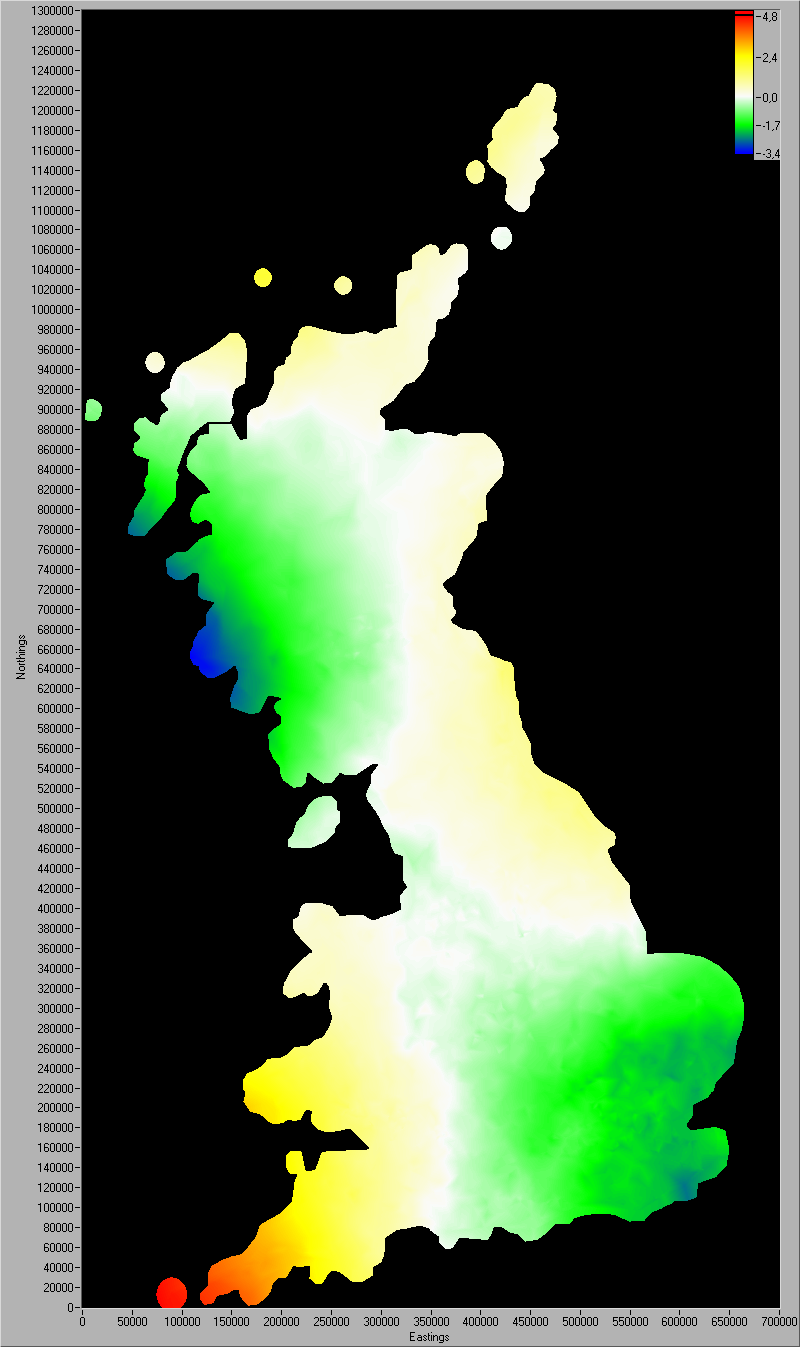 The transformation from the OSGB36 to the WGS84 map-date is only accurate to a maximum value of 5 m. At the images below you can see the differences between this program and the exact value. Click on the images to enlarge.